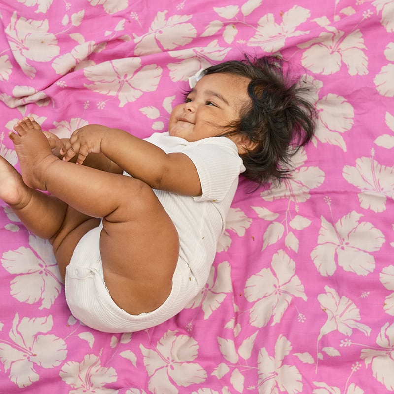 肌寒い夜、アロハテイストのシルクのように肌触りがよくやわらかいベビーブランケットでちょっとラグジュアリーな時間をお過ごしください。