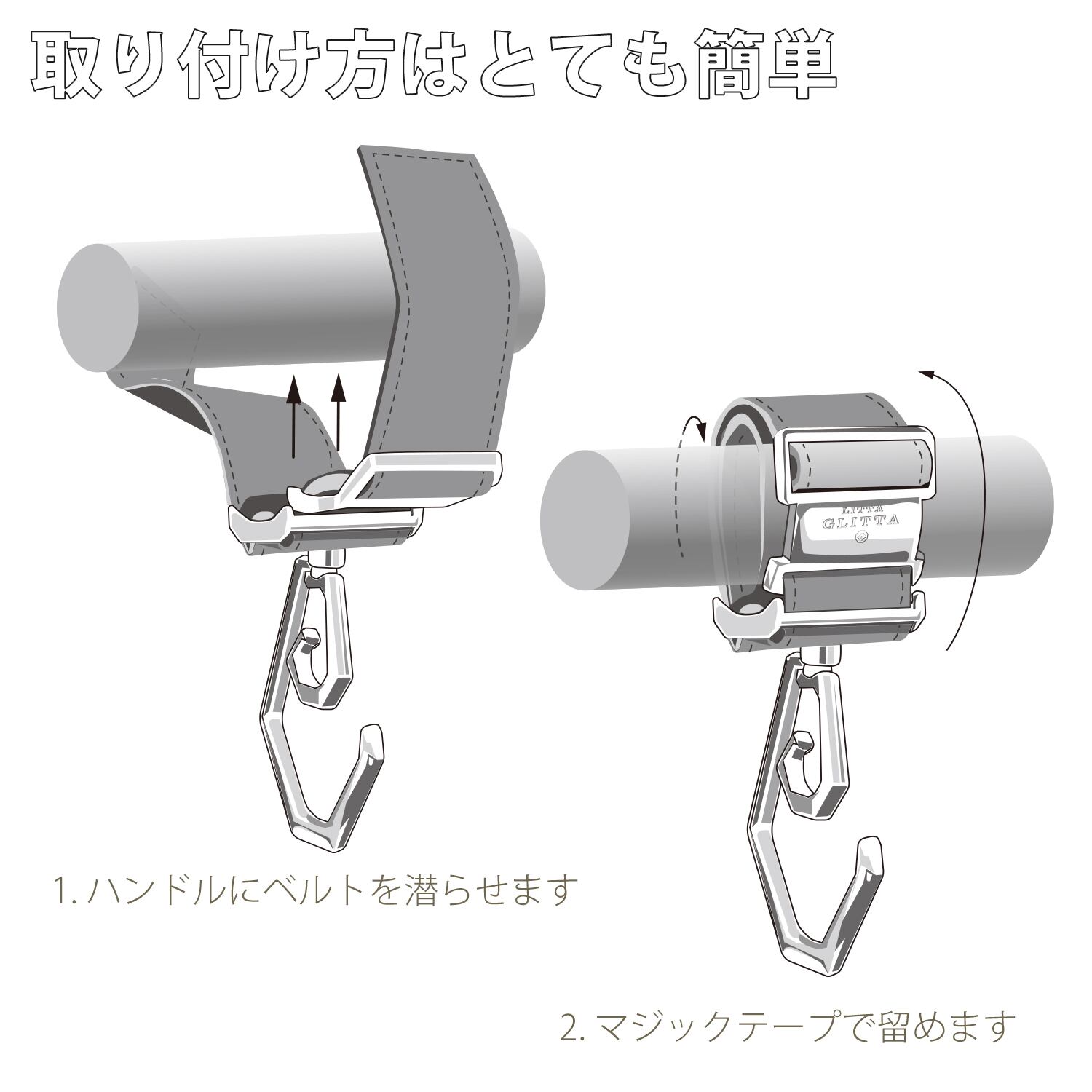 大小のフックがあり、どちらも360°回転。簡単に角度が変えられて、荷物が掛けやすいのが特徴です。